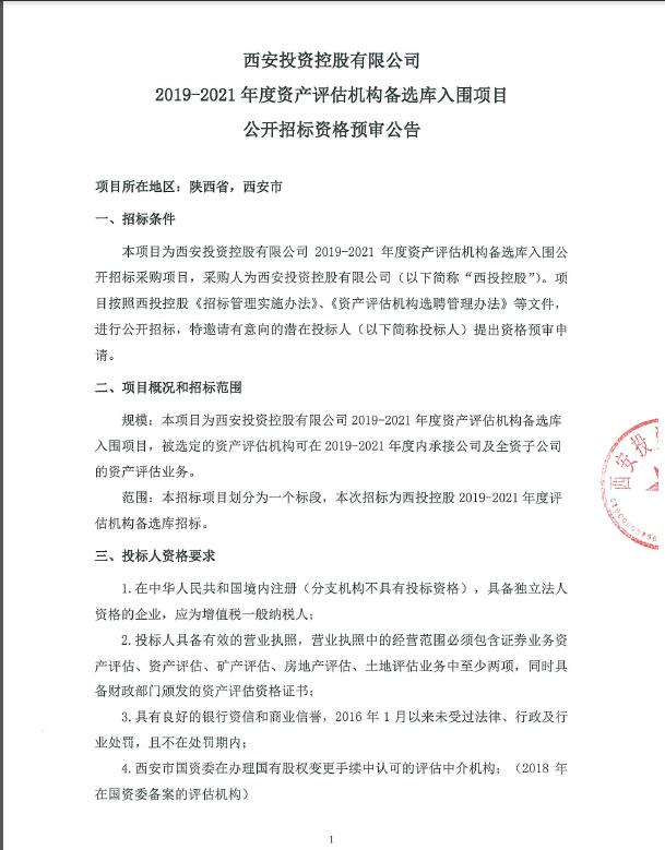 附件1:西安投資控股有限公司---資產評估機構備選庫--公開招標資格預審文件2019-6-3 https://pan.baidu.com/s/1EUKsnmU9RLhdTv-lAKwQDw提取碼:nb6b